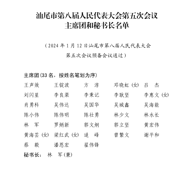 汕尾市第八届人民代表大会第五次会议主席团和秘书长名单
