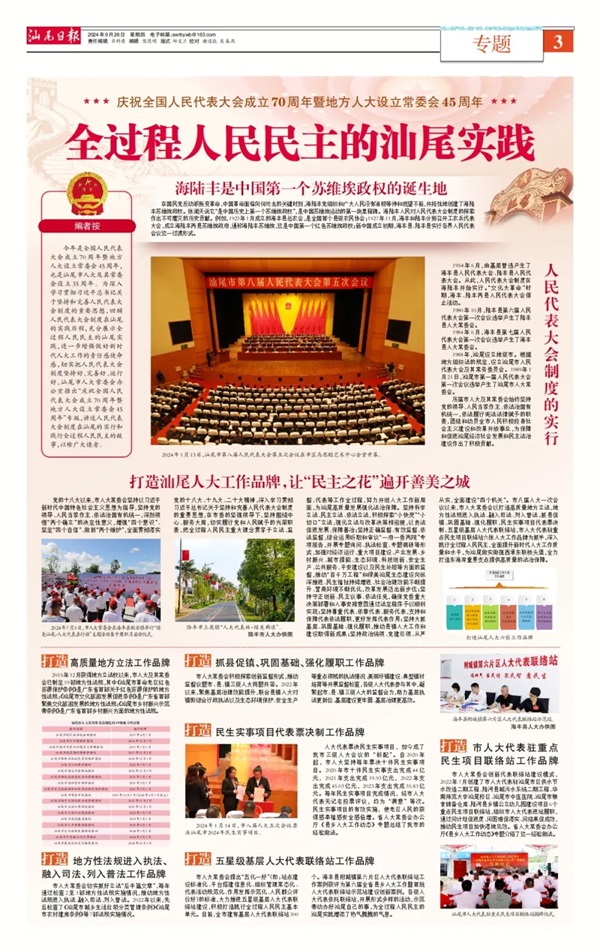 今年是全国人民代表大会成立70周年暨地方人大设立常委会45周年,也是汕尾市人大及其常委会设立35周年。为深入学习贯彻习近平总书记关于坚持和完善人民代表大会制度的重要思想,回顾人民代表大会制度在汕尾的实践历程,充分展示全过程人民民主的汕尾实践,进一步增强做好新时代人大工作的责任感使命感,切实把人民代表大会制度坚持好、完善好、运行好,汕尾市人大常委会办公室推出“庆祝全国人民代表大会成立70周年暨地方人大设立常委会45周年”专版,讲述人民代表大会制度在汕尾的实行和践行全过程人民民主的故事,以飨广大读者。