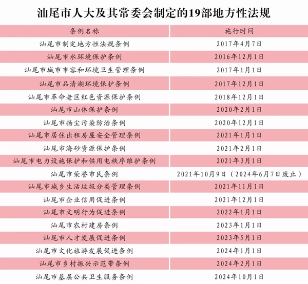 2015年12月获得地方立法权以来,市人大及其常委会已制定19部地方性法规,其中《汕尾市革命老区红色资源保护条例》是广东省首部关于红色资源保护的地方性法规;《汕尾市文化旅游发展促进条例》是广东省首部聚焦文化旅游发展的地方性法规;《汕尾市乡村振兴示范带条例》是广东省首部乡村振兴方面的地方性法规。
