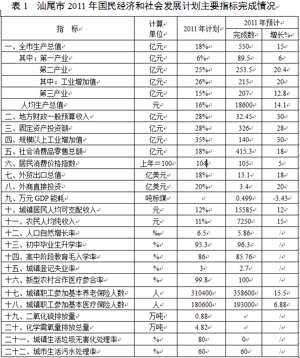 2011年是“十二五”的开局之年,也是我市实现“五年大变化”目标的决战年,在市委的坚强领导下,在市人大和市政协的监督支持下,全市以科学发展观为指导,紧紧围绕年初安排的经济社会发展目标任务,大力实施“深汕合作、海岸经济、宜居城乡、人文环境”四大战略,贯彻落实“争当促进区域协调发展排头兵”各项举措,开拓进取,扎实工作,各项工作稳步推进,促进了经济社会持续快速发展,基本完成了市五届人大七次会议确定的各项目标任务,实现了“十二五”经济社会发展的良好开局。(见表1)。