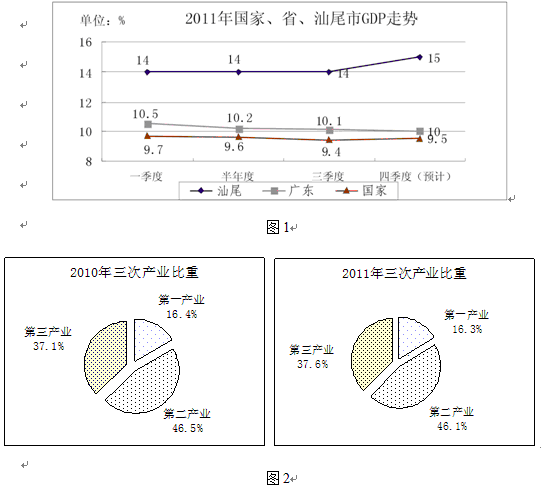 全市GDP突破500亿元大关,2011年预计完成地区生产总值550亿元,增长15%,高于全省5个百分点(见图1)。其中第一产业增加值89.5亿元,增长6%;第二产业增加值253.5亿元,增长20.4%;第三产业增加值207亿元,增长12.8%。三次产业结构由2010年的16.4︰46.5︰37.1(图2)调整为2011年的16.3︰46.1︰37.6(图3)。财政收入快速增长,预计全市财政一般预算收入32.45亿元,增长30%。国民经济整体运行态势良好,呈现产业结构继续优化,经济增长稳中趋快态势。